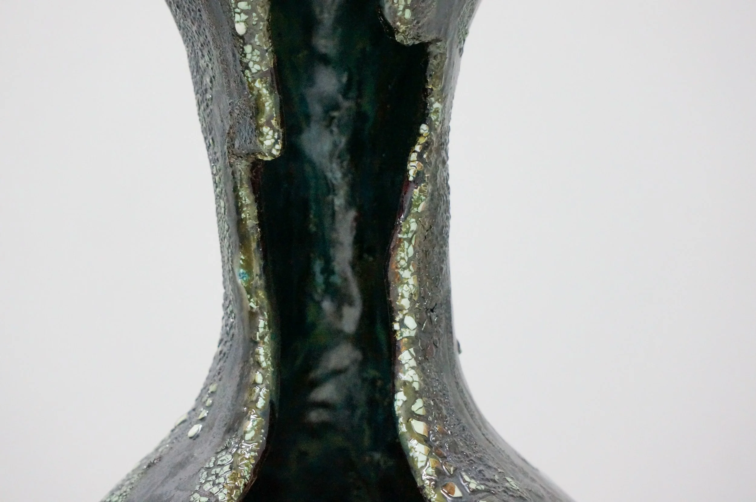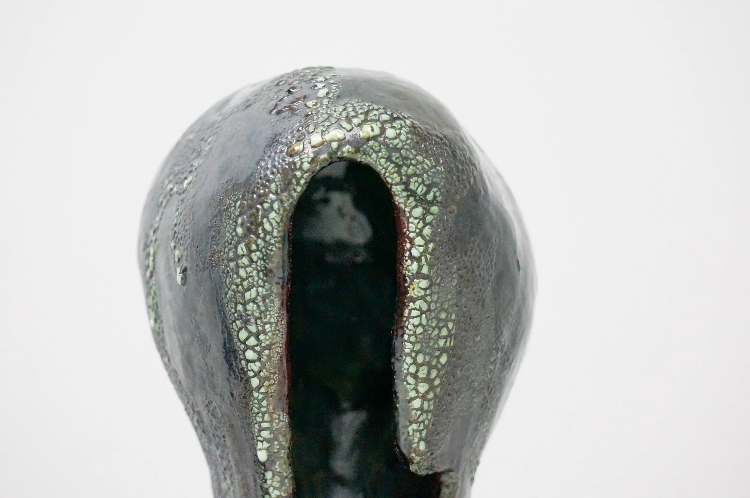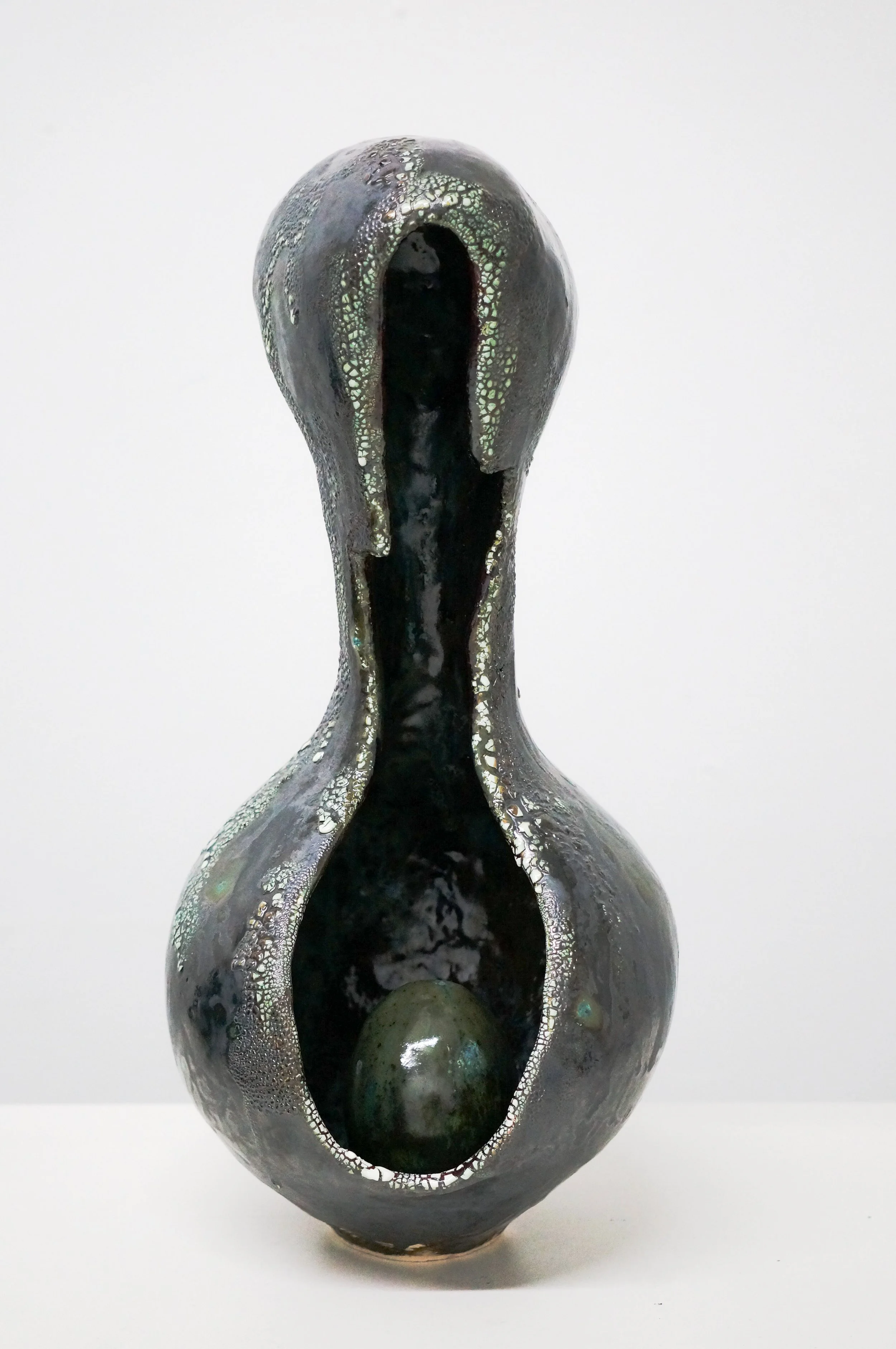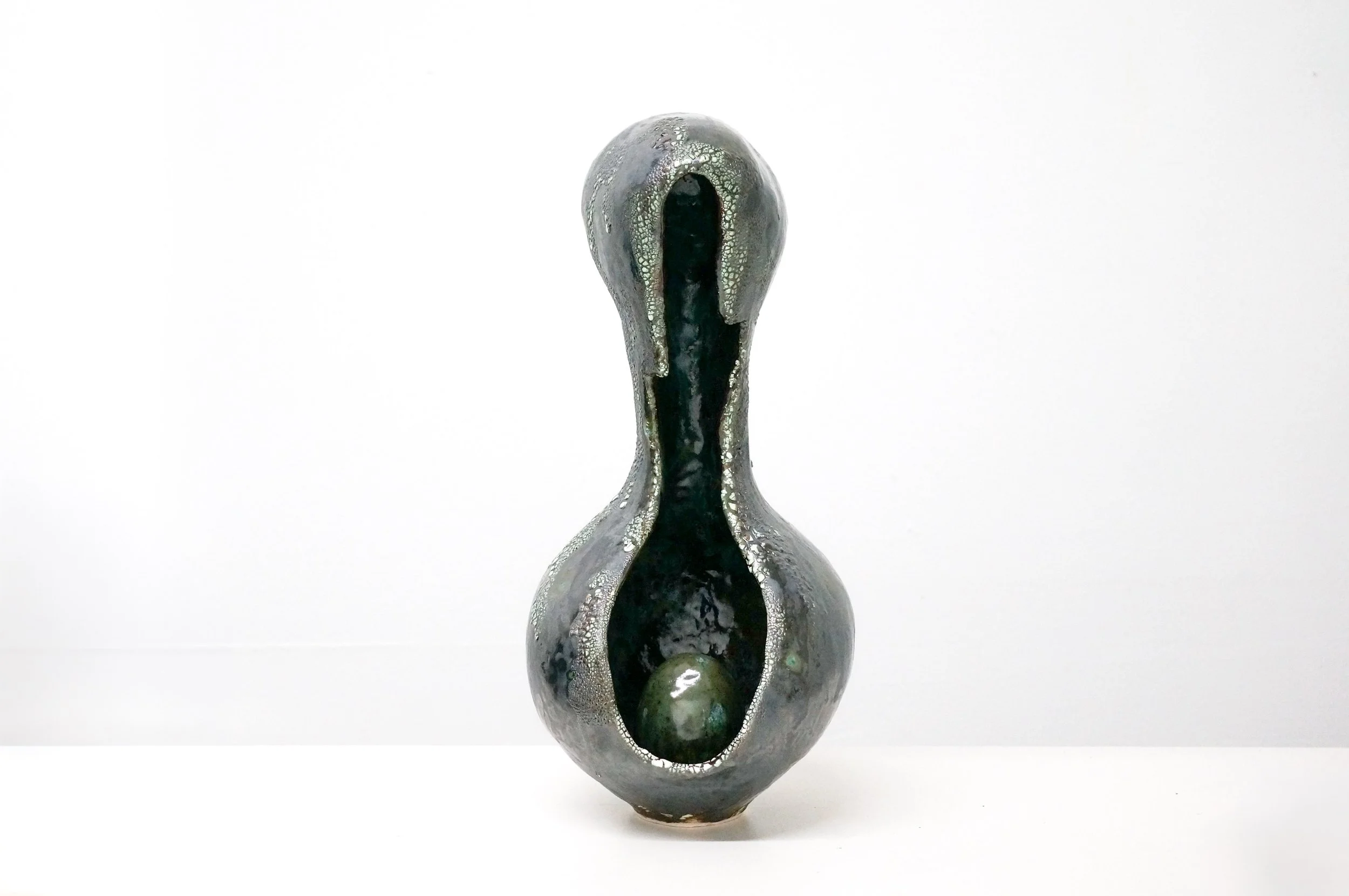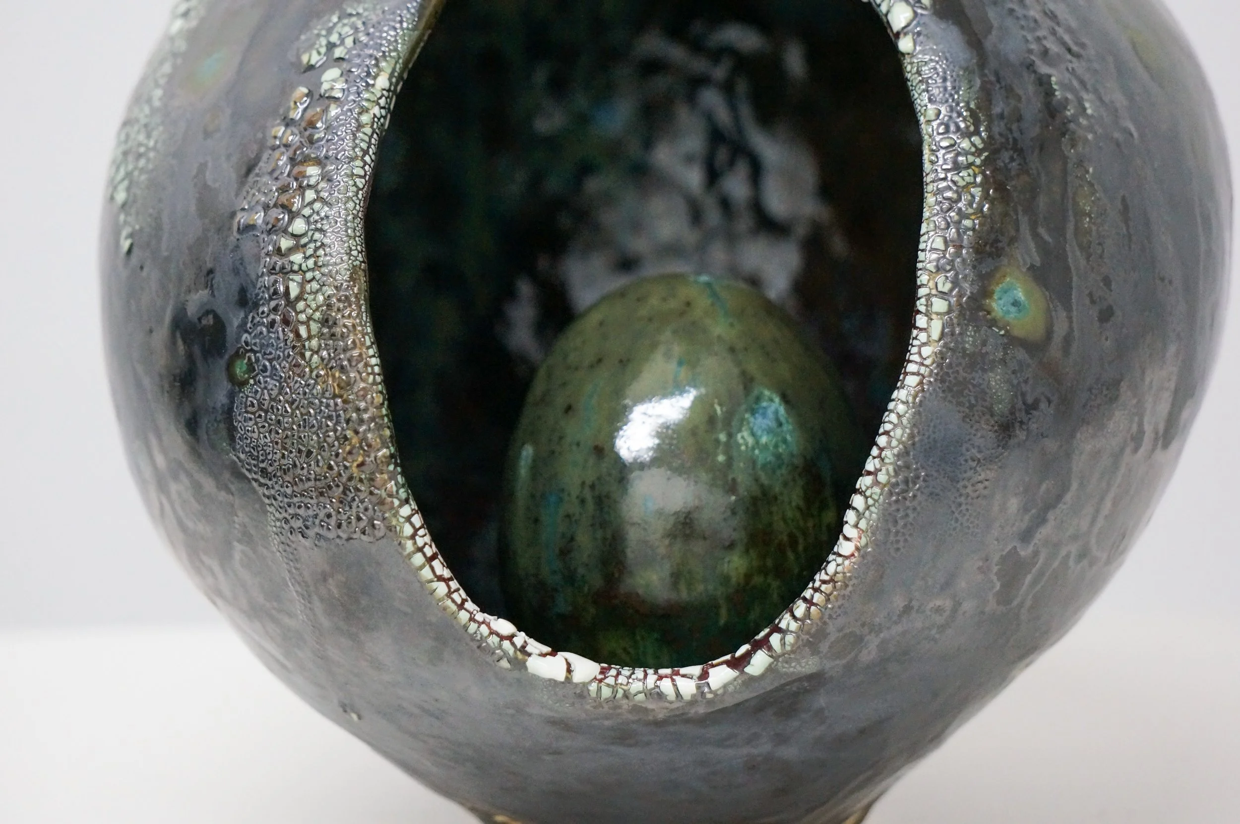 A ceramic figure shaped like a vessel containing a jade ceramic egg.